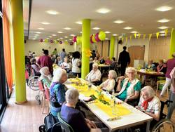 Um das gesellige Beisammensein ging es auch im Haus Karlsruher Weg – aufgrund des schlechten Wetters ausnahmsweise drinnen. Davon ließen sich die Bewohnerinnen und Bewohner allerdings nicht die gute Laune verderben. Musiker Dieter Farrenkopf sorgte für ausgelassene Stimmung. Es wurde gesungen und gefeiert. In großer Runde ließen sich alle das leckere Essen schmecken. Der Raum war bunt geschmückt, die Tische sommerlich dekoriert.