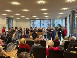 Zusammen mit den Bewohnerinnen und Bewohnern des Friedensheims sang der Chor schließlich Volkslieder, wie „Hoch auf dem gelben Wagen“, „Alle Vögel sind schon da“ oder „Bunt sind schon die Wälder“. Es zeigt sich: Musik verbindet!