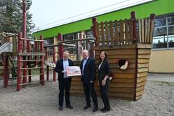 V.l.n.r.: Christoph Röckinger, Einrichtungsleitung Hohberghaus; Thomas Baumeister, Geschäftsführer der Neff GmbH und Standortleiter in Bretten; Karina Merten, Fundraising und Veranstaltungen Hohberghaus, vor dem viel genutzten Spielschiff auf dem Außengelände des Hohberghauses.